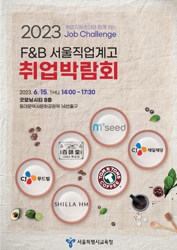 [제주교통복지신문 김강석 기자] 서울특별시교육청은 F&B(Food & Beverage, 식음료) 분야 우수 기업과 관련 전공 학생들의 취업 매칭의 장을 마련하기 위해 ‘2023 F&B 서울 직업계고 취업박람회’를 6월 15일 굿모닝시티 8층에서 개최한다.