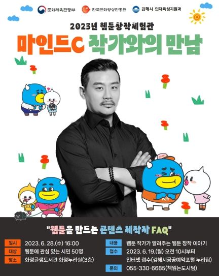 [제주교통복지신문 김강석 기자] 김해시 오는 28일 오후 4시에 화정글샘도서관 화정누리실에서 웹툰에 관심 있는 시민 50명을 대상으로 웹툰작가 ‘마인드C’와 함께하는 작가와의 만남을 개최한다고 밝혔다.