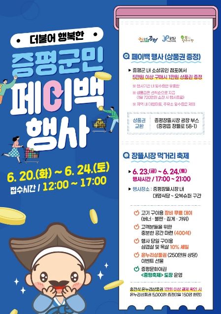 [제주교통복지신문 김강석 기자] 증평군이 6월 20일부터 24일까지 5일간 침체된 지역경기를 극복하고 활력 넘치는 상권 분위기 조성을 위해 지역 내 모든 소상공인 점포를 대상으로‘더불어 행복한 증평군민 페이백 행사’를 추진한다고 15일 밝혔다.