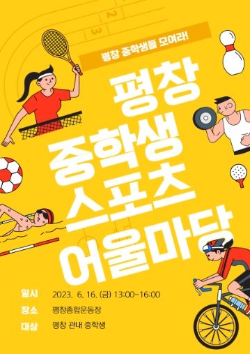 평창 중학생 스포츠 어울마당은 16일 오후 1시부터 4시까지 평창종합운동장에서 열리며, 관내 중학생 220여 명이 6개 종목에 참여한다.