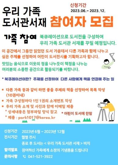 이번 프로그램은 다른 가족과 함께 나누고 싶은 주제를 선정해 도서관 서재를 꾸미며 다른 사람에게 책을 연결해주는 활동이다. 기간은 오는 12월까지 운영할 예정이다.