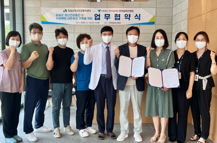 [제주교통복지신문 김강석 기자] 임실군정신건강복지센터가 자살 및 정신건강 위기 대상자의 효율적인 개입과 치료 및 지역 정신건강서비스 연계 시스템 활성화를 위해 완주의료재단 한마음화산병원과 업무협약을 맺었다.