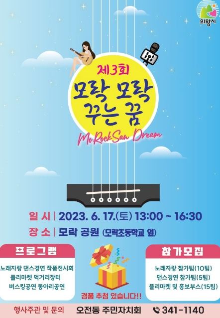 [제주교통복지신문 김강석 기자] 의왕시 오전동 주민자치회는 오는 6월 17일 오후 1시, 오전동 모락공원에서 ‘제3회 모락모락 꾸는 꿈’ 축제를 개최한다고 밝혔다.