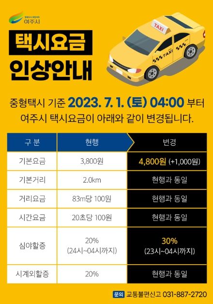 [제주교통복지신문 김강석 기자] 여주시는 오는 7월 1일 오전 4시부터 택시요금을 인상한다고 15일 밝혔다.