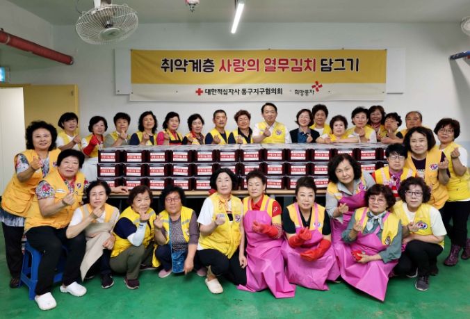 행사에는 김찬진 동구청장과 최춘연 대한적십자사봉사회 동구지구협의회장 및 회원 30여명이 참여, 정성껏 준비한 재료로 열무김치를 담가 소외된 이웃들에게 전달했다.