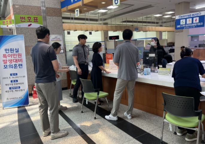 [제주교통복지신문 김강석 기자] 인천시 계양구는 14일 구청 1층 민원실에서 특이민원 발생 대비 모의훈련을 실시했다.