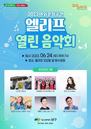 [제주교통복지신문 김강석 기자] 대구광역시 남구는 지역민의 일상 속 문화 향유기회 확대와 지역 예술가들의 수준 높은 공연 활동 지원을 위해 2023 문화가 숨 쉬는 남구! 야외 문화 공연 엘리프 열린 음악회를 개최한다.