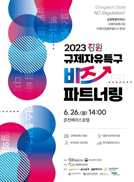[제주교통복지신문 김강석 기자] 강원특별자치도는 6월 11일 특별자치도 출범에 맞추어 현정부 규제혁신의 대표적 사업인 규제자유특구 활성화와 특구기업의 투자유치 환경을 조성하고자 6월 26일 14시 춘천시 ORA호텔베어스에서 '2023 규제자유특구 비즈 파트너링'행사를 개최한다고 밝혔다.