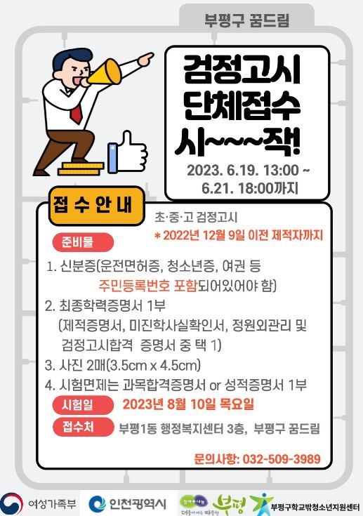 [제주교통복지신문 김강석 기자] 인천시 부평구학교밖청소년지원센터가 19일~21일까지 ‘2023년 제2회 검정고시’ 단체 원서접수를 진행한다.