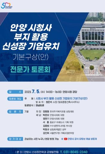 [제주교통복지신문 김강석 기자] 안양시는 지난 4월 주민참여 원탁회의에 이어 오는 7월 5일 14시 안양시청 강당에서 ‘시청사 부지 활용 신성장 기업유치 기본구상(안)’을 주제로 전문가 토론회를 개최한다고 15일 밝혔다.