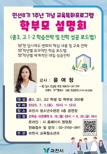 [제주교통복지신문 김강석 기자] 과천시가 오는 7월 1일 오전 10시, 청소년수련관 4층 공연장에서 ‘입시전문가와 함께하는 학부모 설명회’를 개최한다.