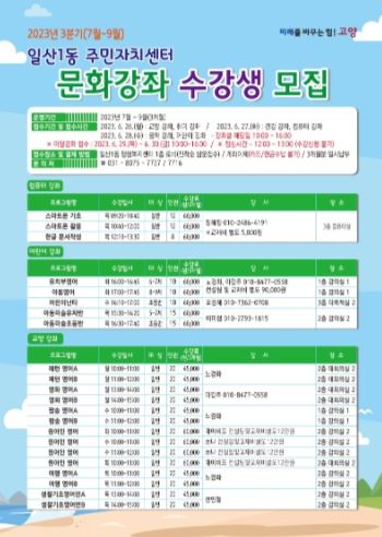 [제주교통복지신문 김강석 기자] 고양특례시 일산1동 주민자치회는 오는 6월 26일부터 28일까지 2023년 3분기(7월~9월) 문화강좌 수강생을 모집한다.