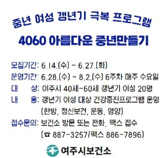 프로그램은 6월 28일부터 8월 2일까지 6주간 주 1회씩 진행되며 포괄적인 건강증진서비스 제공을 통해 갱년기 여성의 건강증진을 위함이다.