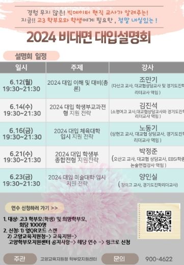 [제주교통복지신문 김강석 기자] 경기도고양교육지원청 학부모지원센터에서는 코앞으로 다가온 수시모집에 대비하여 고3 학부모와 학생 대상의 2024 대입설명회를 알차고 심도있게 준비했다.