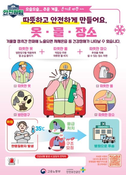 고용노동부는 한파에 취약한 건설현장 등 옥외 작업이 많은 사업장에 대해 한랭질환 예방수칙 이행 여부를 집중 점검할 예정이며, 사업장에서 한파 대비 예방조치를 자율적으로 사전 점검하고, 자체 예방대책을 마련할 수 있도록 적극 지도할 계획이다.