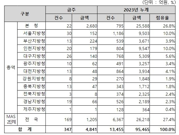 지역별 발주량을 보면, 총액계약 대상 3,636억 원 중 본청이 2,680억 원으로 73.7%를 집행하고 서울청 등 11개 지방청에서 956억 원을 각각 집행할 예정이다.