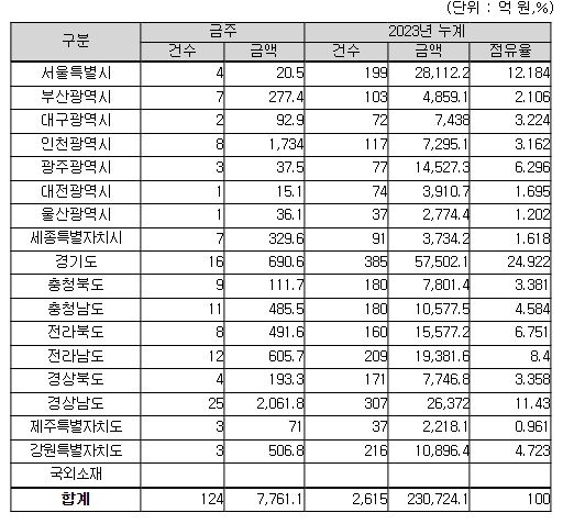 지역별로는 경상남도 2,062억 원, 인천광역시 1,734억 원, 경기도 691억 원, 그 밖의 지역이 3,274억 원이다.