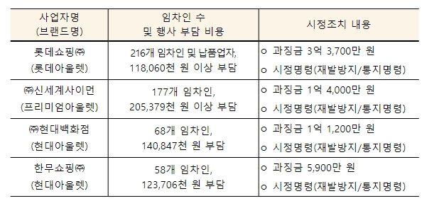 [제주교통복지신문 송한신 기자] 공정거래위원회는 대형 아울렛 4개사가 판매촉진 행사 실시 전에 서면 약정하지 않고 매장임차인)에게 행사 비용을 부담시킨 행위에 대해 시정명령 및 과징금(6억 4,800만 원) 부과를 결정했다.
