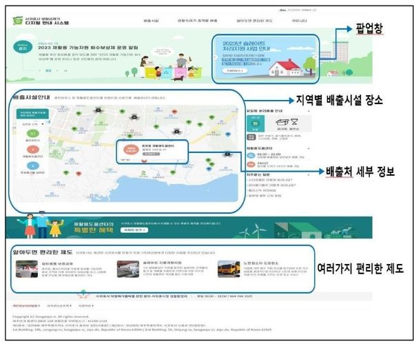 웹페이지는 △거주지 인근 재활용도움센터 및 클린하우스 위치, △생활쓰레기 품목별 분리 배출 안내(한글, 영문, 중문), △대형폐기물 배출 신청, △영농폐기물 배출처 및 배출 방법, △명예환경감시원 운영 및 플로깅 활동, △각종 사업장 폐기물처리업체 연락처 등의 정보를 한 화면에서 함께 제공한다.
