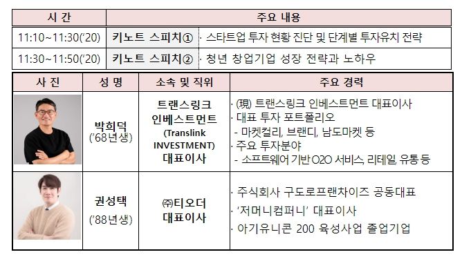 행사에 참여한 중소벤처기업부 이석호 청년보좌역은 “청년창업은 청년들이 스스로 미래를 만들어 나가기 위한 주요한 방법의 하나”라며, “청년창업 선배로서 창업 후배들께 도움이 되도록 겪었던 경험을 나누겠다”고 말했다.