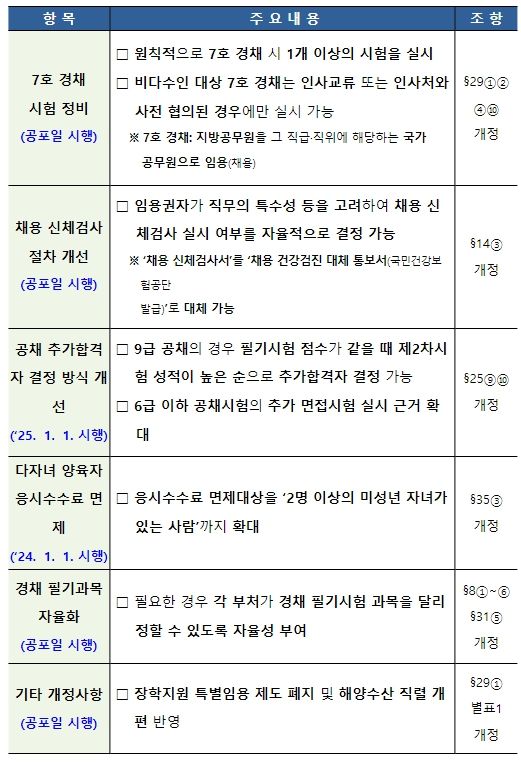 이 밖에도 필요한 경우 각 부처가 직무의 특수성 등을 고려해 경력경쟁채용 시 필기시험 과목을 달리 정할 수 있도록 자율화한다.