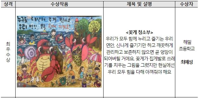 포스터 그리기 부문 최우수상을 수상한 최예성 학생(세종시 해밀초)의 ‘꽃게 청소부’ 작품은 꽃게가 집게발로 쓰레기를 치우는 모습을 묘사하여 소중한 우리 연안을 보전하고 깨끗하게 관리하기 위해서는 모두가 노력해야 한다는 메시지를 담았다는 점에서 우수한 평가를 받았다.
