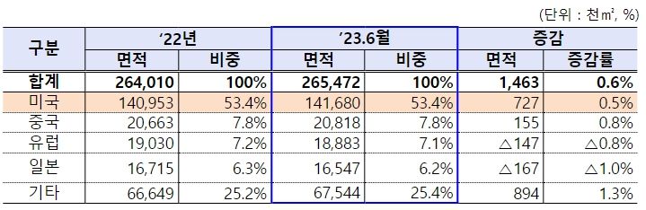 (토지) 외국인이 보유한 국내 토지면적은 265,472천㎡로, 전체 국토면적(100,443,553천㎡)의 0.26% 수준이다.