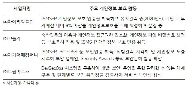 ‘숙박 플랫폼 분야 개인정보 처리현황 분석 결과’에 따르면 숙박 플랫폼 4개 사는 숙박업소 등 이용사업자가 플랫폼에 접속 시 최대 접속시간 제한, 예약정보 파일 내려받기(다운로드) 시 비밀번호 설정 등 암호화, 이용자 퇴실 후 개인정보 가림처리(마스킹) 등 이용자 대상 개인정보 보호조치를 대체로 잘 적용하고 있는 것으로 나타났으나, 플랫폼 내 또는 플랫폼 간 일부 항목들의 보호수준 상에는 편차도 존재하여 상호 벤치마킹 등이 필요하였다.