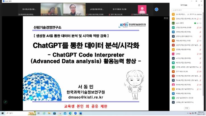 이번 세미나는 산림과학 연구자들의 데이터 분석 및 시각화 역량을 강화하기 위해 마련된 자리로 연구 데이터 구축 및 관리 방안과 생성형 인공지능(AI)을 통한 빅데이터 분석을 주제로 분야별 전문가를 초청하여 진행했다.