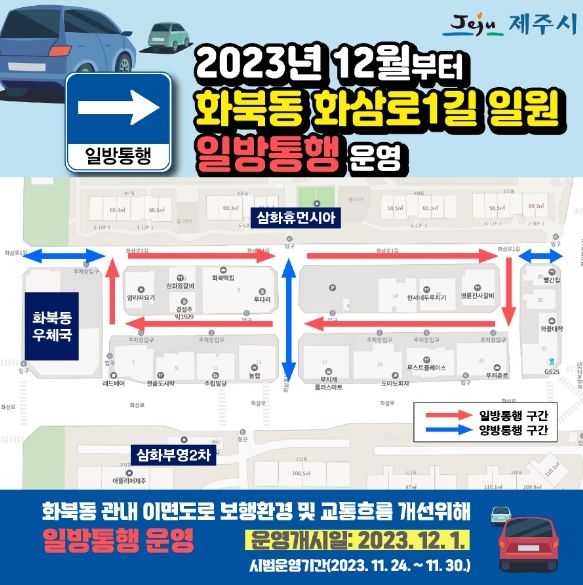 [제주교통복지신문 김현석 기자] 제주시는 이면도로의 안전하고 쾌적한 교통환경을 위해 조성한 화북동 화삼로1길 주민주도형 일방통행로 운영을 12월 1일부터 본격 개시한다.