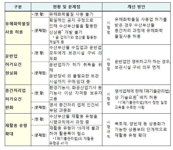 또한 영세 수산부산물 재활용업체(중간처리업체) 허가요건도 완화했다. 수산부산물 재활용업체는 환경기능사 등 기능사 이상의 전문가를 1명 이상 고용해야 하는데, 전문가 임금상승으로 어려움을 겪고 있었다. 이에 따라, 이번 하위법령 개정안에서는 일일 재활용 용량이 10톤 미만인 영세업체에 한해 직원 중 1명 이상을 「폐기물관리법」에서 인정하는 기술요원으로 고용해도 허가요건을 충족하는 것으로 규제를 완화했다.
