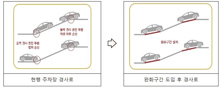 기존에는 주차장 설치기준 중 경사로 완화구간에 대한 규정이 없어 경사로를 통행하는 차량 하부가 경사로 종점 구간에 부딪히거나, 주차장에서 출차 시 운전자의 시야제한으로 출입구 전면을 통행하는 차량이나 사람과의 접촉사고가 발생할 우려가 있었다.