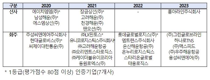 해양수산부는 장기운송계약 체결, 국적선사 이용 등 선·화주 간 상생을 위해 노력하고 인증기준을 충족한 기업이 우수 선화주기업 인증을 신청하면, 90일간의 심사를 거쳐 선정한 뒤 3년 기한의 인증서를 수여한다. 현재까지 총 8개 선사, 20개 화주사 등 총 28개 기업이 선정된 바 있다.