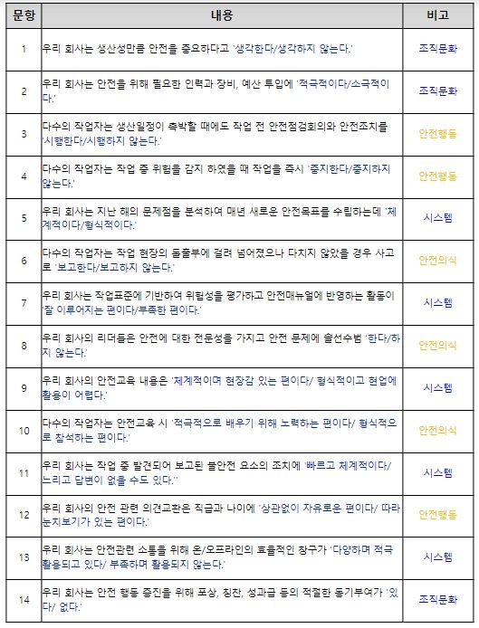 이에 정부는 사업장에서 손쉽게 안전문화 수준을 측정하고, 개선요인을 파악할 수 있도록 KSCI를 개발하고 있다. KSCI는 기업의 안전의식 수준, 노‧사 참여도, 안전 제안 제도 운영현황 등을 반영하여 기업의 안전문화 활동 증진을 위해 개발하고 있는 평가지표로 현재 14문항의 약식 버전과 51문항의 전체 버전으로 잠정 개발안이 나온 상황이다.