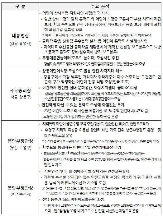 ▴부산 수영구에서 해안가라는 지역특성에 맞추어 어린이 생존수영캠프 운영 등 광(밝고)안(안전한)리(이곳) 안전프로젝트를 추진한 것과, ▴전남 순천시에서 전남 동부권 최초로 어린이교통공원을 조성하고 민간 전문강사인 ‘시민안전리더’를 공개모집해 지역특성에 맞는 안전교육을 실시해 온 것도 어린이 안전을 강화한 모범 사례로 선정됐다.