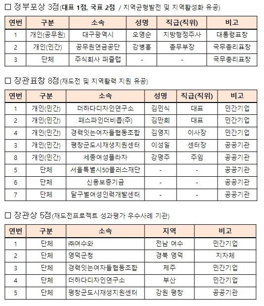 이외에도, 그간 재도전 및 지역 활력 지원에 이바지한 개인과 단체의 노고를 격려하기 위해 대통령표창 1점, 국무총리표창 2점, 행정안전부 장관 표창 5점을 수여한다.