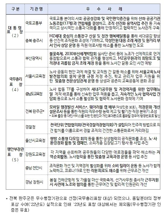 한편, 공무원 노사문화 우수행정기관 선정과 포상은 공직사회에 상생‧협력의 노사문화를 확산시키기 위해 공무원노조, 공무원직장협의회 등 공무원단체와 기관의 우수사례를 인증하고 포상하는 제도로서 2010년부터 운영되고 있으며 2023년까지 138개 기관이 우수기관으로 선정됐다.