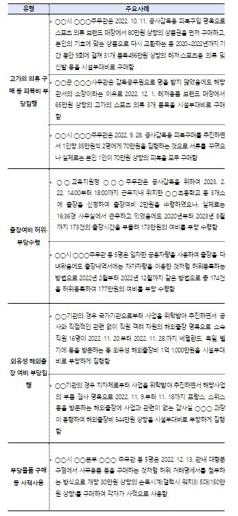 2개 공직유관단체는 공사감독 업무와 무관하게 국외출장 여비를 집행했다. 일부 지자체는 허위 거래명세서를 첨부하는 방법으로 고가의 손목시계, 외장하드 등을 구입해 사적으로 사용했다.