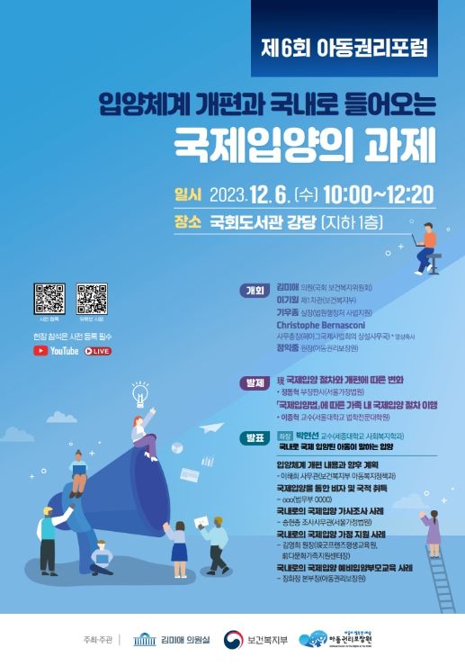 이번 포럼은 새롭게 제정된 '국제입양에 관한 법률'에 따라 향후 보건복지부가 중앙당국이 되어 국제입양절차를 진행하는 과정에 있어 준비해야 할 과제를 법원, 법무부 등 유관기관과 학계가 함께 모색하기 위해 개최됐으며, 아동권리보장원 유튜브 채널을 통해 생중계된다.