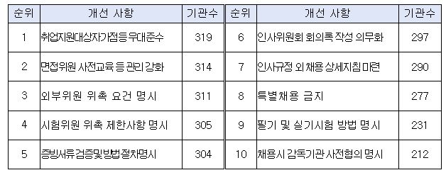 공직유관단체에 대한 개선 권고가 빈발한 항목은 ▴'국가유공자법'에 따른 취업지원 대상자 가점 및 동점자 우대 준수(319개) ▴차별 소지가 있는 질문 금지 등 면접위원 사전교육 관리 강화(314개) ▴퇴직 후 3년이 경과하지 않은 자 위촉 금지 등 외부위원 위촉 요건 명시(311개) 등이 가장 많았다.