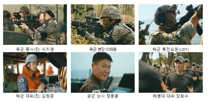 영상에는 ▲발레리나를 꿈꿨으나 군인으로 새로운 꿈을 펼치고 있는 육군 이지영 중사(진), ▲유학 생활 중 군 복무를 위해 돌아온 육군 이태웅 병장, ▲셰프 출신의 UDT 대원, ▲임관 후 처음으로 혼자 살기 시작해 올해 자취생활 3년째 되는 해군 김원준 대위(진), ▲우주와 하늘이의 아버지 공군 정동훈 상사, ▲뒤집기에 성공한 딸 자랑에 여념이 없는 해병대 장희수 대위 등이 주인공으로 출연한다.