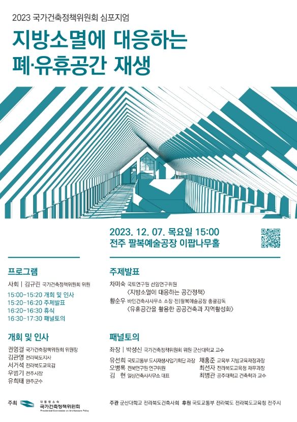 국가건축정책위원회와 국토교통부, 전라북도은 12월 7일 오후 전주 팔복예술공장에서 “지방소멸에 대응하는 폐·유휴공간 재생 심포지엄”을 개최한다고 밝혔다.