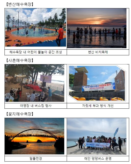 이번에 우수해수욕장으로 선정된 3곳 모두 환경, 시설, 안전, 물가 등 전반적인 관리·운영 역량을 인정받은 것은 물론, 사계절 모두 해수욕장을 이용할 수 있도록 다양한 콘텐츠를 마련했다는 점에서 좋은 평가를 받았다. 구체적으로, 지역 특색을 활용한 개성있는 행사·축제를 개최하고, 최근의 여행 유형을 반영하여 차박 및 반려동물 허용 구역을 지정하는 등 단순 해수욕 외에도 해수욕장을 다채롭게 즐길 수 있는 방안들을 마련했다.