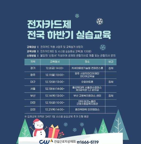 [제주교통복지신문 송한신 기자] 건설근로자공제회는 12월 8일을 시작으로 전국 7개소에서 약 600명의 건설 사업주를 대상으로 ‘찾아가는 전자카드 실습교육’을 실시한다고 밝혔다.