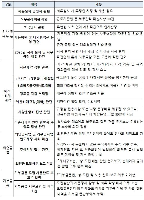 마지막으로, 국민 성금 모집 및 사용에 대해서는 의연금품·기부금품 각 관련 법령에 따라 검사했으며, 사업 간 회계를 분리하지 않고 혼용하거나 성금의 모집과 사용에 대한 보고 및 공개 처리가 미흡한 점 등을 확인했다.