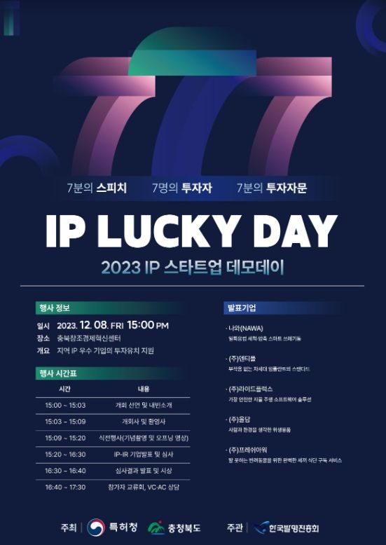 행사는 창업 7년 미만의 기업을 대상으로 새싹기업(스타트업)의 성장에 있어서 지식재산의 중요성을 알리고 지식재산(IP, Intellectual Property)을 기반으로 투자를 받을 수 있는 기회를 만들기 위해 마련됐다.