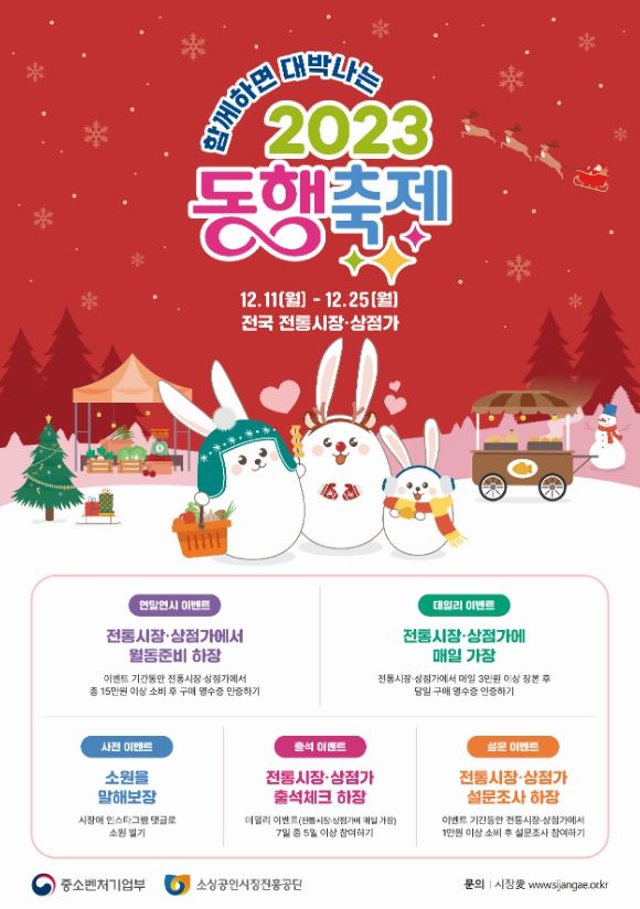 전국 1,800여개 전통시장 및 상점가(이하 전통시장)에서 이번 눈꽃 동행축제의 ‘온 국민 힘모아, 온기를 나누자’라는 운동(캠페인)의 일환으로 전통시장 활성화를 위해 11일부터 25일까지 전통시장만을 위한 다채로운 프로그램을 운영한다.