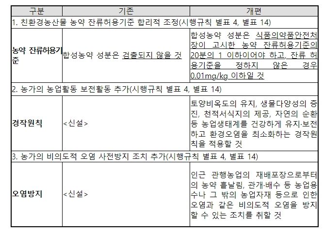 주요 개정 내용은 다음과 같다. 첫째, 친환경농산물 농약 잔류허용기준(MRL)을 비의도적인 오염으로 인한 농가 피해를 줄이고 친환경농업을 확대하기 위해 '식품위생법'에 따라 ‘식품의약품안전처장이 고시한 농약 잔류허용기준의 20분의 1이하’(MRL이 미설정된 경우에는 0.01mg/kg(ppm)이하)로 조정했다. 다만 의도적 농약 사용시에는 검출량에 상관없이 ‘인증취소’ 한다.