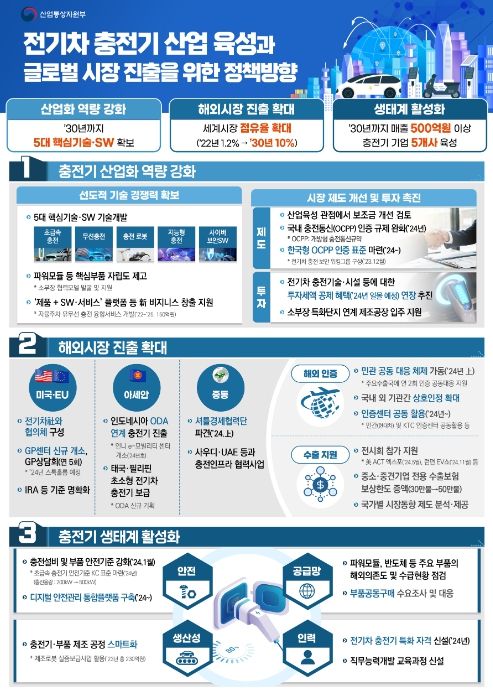 정부는 업계 간담회 등을 통해 전기차 충전기 산업 육성과 글로벌 시장 진출을 위한 정책방향을 마련했다. △충전기 산업화 역량 강화, △해외시장 진출 확대, △충전기 생태계 활성화 등 3대 축으로, ’30년까지 5대 핵심기술‧SW를 확보하고, 세계시장 점유율을 ’22년 1.2%에서 ’30년 10%로 끌어올리는 한편, 매출 500억원 이상 충전기 제조사를 5개 이상 육성한다는 목표를 제시했다.