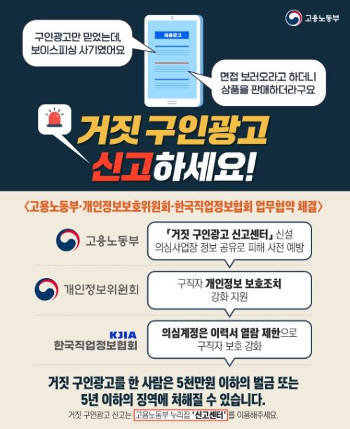 업무협약에는 고용노동부는 ▲‘거짓 구인광고 신고센터*(온라인)’를 신설하여 구직자 신고에 대해 즉시 조사·수사 의뢰하고 ▲법 위반 의심 사업장 정보를 민간에 공유하여 계정 정지·가입 제한 등 조치를 할 수 있도록 하여 거짓·허위 구인 광고에 대한 신속한 대응 및 예방체계를 구축하며 개인정보보호위원회는 ▲ ‘사전적정성 검토’를 통해 고용노동부가 의심 사업장 정보를 민간에 공유할 수 있도록 하는 한편 ▲ 인적자원(HR) 채용 분야 민간협력 자율규제’를 추진하여 구인·구직사이트가 자발적으로 개인정보 보호조치를 점검·개선하도록 하고 한국직업정보협회는 회원사가 ▲의심 활동 계정(단기간 이력서 과다 열람 등)은이력서 열람을 제한하고, 구직자가 본인의 이력서 열람 내역을 확인할 수 있도록 하며 ▲고용부에서 공유받은 의심 사업장에 대해서는 즉시 계정 정지 등 조치하는 내용 등이 담겼다.